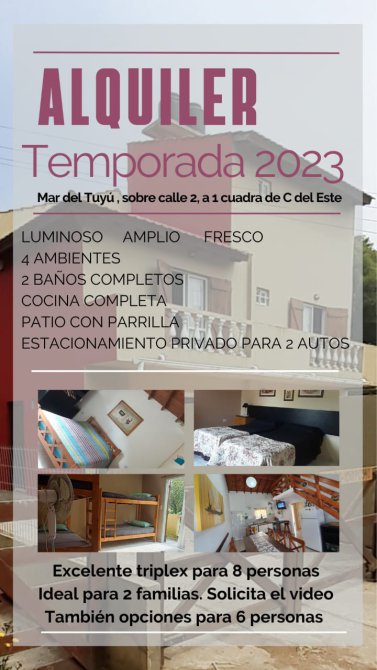 COMODIDADES: ESPACIO PARA VARIOS AUTOS, COCINA-COMEDOR, BAÑO COMPLETO EN PLANTA BAJA Y PATIO CON PARRILLA. EN PLANTA ALTA UN DORMITORIO MATRIMONIAL, UN BAÑO COMPLETO, UN SEGUNDO DORMITORIO CON DOS CAMAS CUCHETAS Y UN TERCER DORMITORIO EN ALTILLO CON DOS CAMAS SIMPLES.